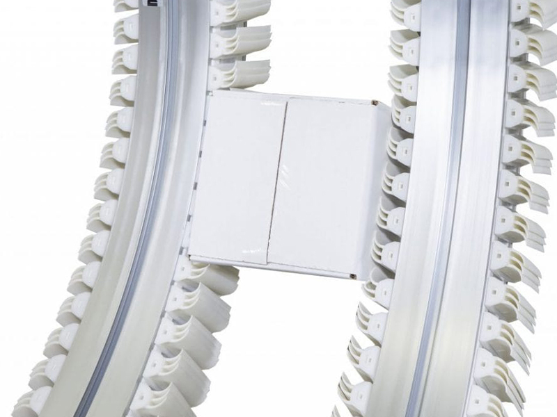 夾持輸送機由2臺相互平行的FlexMove輸送機組成,利用聚氨酯夾緊鏈板楔夾住產(chǎn)品的兩側實現(xiàn)垂直升降。